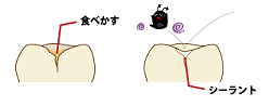 お子様には、虫歯予防としてフッ素塗布、シーラントを行っております。6歳頃生え始める子どもの奥歯は溝が深く虫歯になりやすいのでシーラントという樹脂を溝に埋め込み虫歯を予防します。また定期的なフッ素塗布も虫歯予防に有効です。